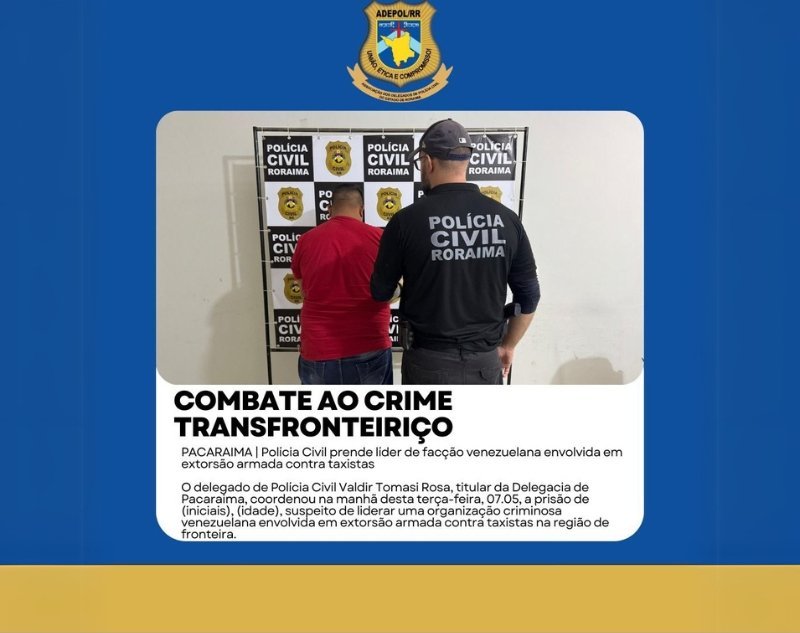 O delegado de Polícia Civil Valdir Tomasi Rosa, titular da Delegacia de Pacaraima, Roraima, coordenou na manhã desta terça-feira, 07.05, a prisão de (iniciais), (idade), suspeito de liderar uma organização criminosa venezuelana envolvida em extorsão armada contra taxistas na região…