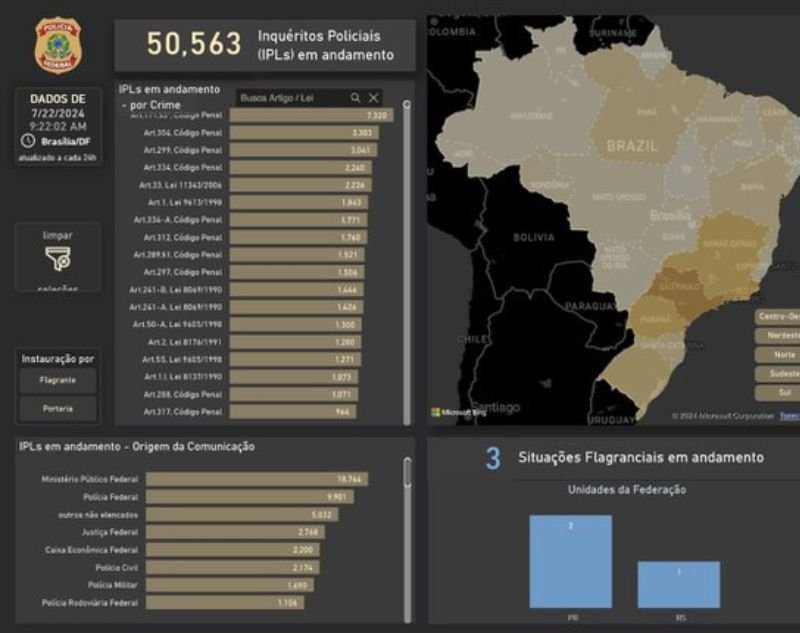 A Polícia Federal disponibiliza nesta segunda-feira (22/7) um novo painel de Business Intelligence (BI) em seu portal de Dados Abertos. A ferramenta oferece uma visão detalhada e dinâmica dos inquéritos policiais em andamento na instituição, com informações quantitativas distribuídas por…
